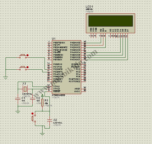 Dalam projek ini saya menggunakan ATmega 8535, fitur yang saya pakai yaitu ekternal interupt 0, eksternal interupt 1 dan timer 1. Sedangkan pada hardware yaitu menggunakan 2 push button dan LCD 2×16.